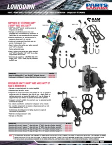 2 NOVEMBRE 2025 PARTSCANADA.COM AVIS: LES PRODUITS AVEC UN CODE EMIS 1 SONT CONFORMES AUX NORMES ANTIPOLLUTION DE TOUS LES ÉTATS, Y COMPRIS LA CALIFORNIE. LES PRODUITS AVEC UN CODE EMIS 2 SONT CONFORMES AUX NORMES ANTIPOLLUTION DE TOUS LES ÉTATS, SAUF LA CALIFORNIE. LES PRODUITS AVEC UN CODE EMIS 3 PEUVENT ÊTRE UTILISÉS UNIQUEMENT EN COMPÉTITION ET NE PEUVENT PAS ÊTRE UTILISÉS DANS AUCUN ÉTAT SUR LES ROUTES SUR LES VÉHICULES CONCERNÉS PAR LES NORMES ANTIPOLLUTION. LES PRODUITS AVEC UN CODE EMIS 4 N’ONT PAS DE RESTRICTIONS SUR LE TERRITOIRE AMÉRICAIN ROUTE • HORS-ROUTE • VTT/VUTT • MOTONEIGE • VÉLO • PNEUS ET ENTRETIEN • CASQUES ET VÊTEMENTS DESCRIPTION NO PIÈCE Support de téléphone Quick-GripMC XL avec RAM® Vibe-SafeMC et base à Boulon en U 0636-0438 SUPPORT DE TÉLÉPHONE RAM® QUICK-GRIPMC XL AVEC VIBE-SAFEMC ET BASE À BOULON EN U • Combinaison du support de téléphone Ram® Quick-GripMC XL et de RAM® Vibe-SafeMC dans une version courte • Fabriqué en composite durable et en matériau en acier inoxydable • Accessoire amortisseur conçu pour protéger les appareils électroniques d'une large gamme de vibrations • La connexion par filetage NPT permet la rotation entre les positions portrait et paysage • Polyvalence de positionnement entre portrait et paysage tout en gardant votre appareil en sécurité • Dispositif d'amarrage à une main • Supports latéraux réglables et poignée supérieure à ressort pour maintenir l'appareil sécurisé • Convient aux rails avec un diamètre de 0,50" à 1,25" • Compatible avec les appareils portables qui respectent les dimensions suivantes: 2,625" à 3,625" de largeur, 5,75" à 8,25" de hauteur et une profondeur de 0,72" DESCRIPTION NO PIÈCE Support de téléphone X-Grip® avec Vibe-SafeMC et petit Tough-ClawMC 0636-0440 Grand support de téléphone X-Grip avec Vibe-Safe et petit Tough-Claw 0636-0439 SUPPORTS DE TÉLÉPHONE RAM® X-GRIP® AVEC VIBESAFEMC ET PËTIT TOUGH-CLAWMC • RAM® Vibe-SafeMC amortit une large gamme de fréquences de vibrations • Fabriqué en matériel composite et en acier inoxydable haute résistance pour la durabilité et la fiabilité dans les environnements les plus exigeants • Structure unique et soigneusement conçue avec toutes les industries à l'esprit • La no pièce 0636-0439 est compatible avec les appareils portatifs adaptés aux dimensions suivantes: 1,75” à 4,5” de large et une plage de diamètre de 1” à 1,6” pour la pince • La no pièce 0636-0440 est compatible avec les appareils portatifs adaptés aux dimensions suivantes: 1,875” à 3,25” de large et une plage de diamètre de 0,625” à 1,14” pour la pince 0636-0440 DESCRIPTION NO PIÈCE Support de téléphone avec Vibe-Safe et base en fourche - court 0603-1135 SUPPORTS DE TÉLÉPHONE RAM® X-GRIP® • Fabriqué en composite durable et en acier inoxydable • Aluminium avec revêtement époxy de qualité marine • Comprend une rotule en caoutchouc d'un diamètre de 1" et un système de douille avec points de réglage des deux côtés du bras à double douille; ce système vous permet, en tournant la poignée sur le bras, de déplacer le support X-Grip® pour obtenir une position de visionnement optimale • Le support à ressort se dilate et se contracte pour un ajustement parfait en fonction de l'appareil • Les embouts caoutchoutés maintiendront le dispositif ferme et stable • Matériel de fixation pour les réservoirs d’embrayage/freinage avec boulons de fixation standard et métriques • Les ensembles comprennent des boulons en U qui conviennent aux rails avec un diamètre de 0,5" à 1,25" 0603-1135