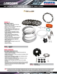PARTSCANADA.COM DÉCEMBRE 2025 LOWDOWN ROUTE • HORS-ROUTE • VTT/VUTT • MOTONEIGE • VÉLO • PNEUS ET ENTRETIEN • CASQUES ET VÊTEMENTS AVIS: LES PRODUITS AVEC UN CODE EMIS 1 SONT CONFORMES AUX NORMES ANTIPOLLUTION DE TOUS LES ÉTATS, Y COMPRIS LA CALIFORNIE. LES PRODUITS AVEC UN CODE EMIS 2 SONT CONFORMES AUX NORMES ANTIPOLLUTION DE TOUS LES ÉTATS, SAUF LA CALIFORNIE. LES PRODUITS AVEC UN CODE EMIS 3 PEUVENT ÊTRE UTILISÉS UNIQUEMENT EN COMPÉTITION ET NE PEUVENT PAS ÊTRE UTILISÉS DANS AUCUN ÉTAT SUR LES ROUTES SUR LES VÉHICULES CONCERNÉS PAR LES NORMES ANTIPOLLUTION. LES PRODUITS AVEC UN CODE EMIS 4 N’ONT PAS DE RESTRICTIONS SUR LE TERRITOIRE AMÉRICAIN NO PIÈCE DESCRIPTION 1130-0893 RADIUSX 4.0 RADIUSX 4.0 POUR TRIUMPH TF 250-X 24 • Élimine le calage du moteur; départ et arrêt sans l’utilisation du levier d’embrayage • Augmente le transfert de puissance par rapport au FEO • Réglage externe, tout en conduisant • Permet un pilotage avec un rapport supérieur, pour un meilleur fonctionnement de la suspension et une économie d’énergie • Ensemble d’embrayage TorqDriveMD qui prolonge la durée d’utilisation de l’embrayage avec moins de réglages au fil du temps • Conserve l’utilisation intégrale et ordinaire du levier d’embrayage et peut neutraliser la fonction automatique en tout temps • Améliore le contrôle du pilote, maximise la traction et la confiance de piloter sur des terrains difficiles • Cylindre récepteur ajustable pour modèles avec embrayage hydraulique • Manchons de panier qui protègent les paniers du FEO contre les encoches • Fabriqué aux États-Unis NO PIÈCE DESCRIPTION 1132-1989 Pannier d'embrayage PANIER D'EMBRAYAGE POUR KAWASAKI KX80/85/100/112 98-25 • Fait à partir d'une billette d'aluminium à anodisation dure qui procure une modulation améliorée de l'embrayage • Durabilité extrême qui permet de résister aux encoches et de prolonger la durée d'utilisation de l'embrayage • Coussinets exclusifs remplaçables qui protègent votre transmission contre les dommages même dans des conditions extrêmes • Tolérances rigoureusement contrôlées pour un bon fonctionnement, moins de friction et une réduction du bruit de l'embrayage • Considérez le panier d'embrayage comme étant la base de tout le système d'embrayage • Usinés avec précision par CNC et dotés d'une conception novatrice de renommée internationale, les paniers d'embrayage Rekluse protègent les éléments internes essentiels afin de vous garder sur la route ou la piste plus longtemps • Fabriqué aux États-Unis