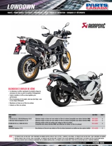 PARTSCANADA.COM FEVRIÉR 2026 LOWDOWN ROUTE • HORS-ROUTE • VTT/VUTT • MOTONEIGE • VÉLO • PNEUS ET ENTRETIEN • CASQUES ET VÊTEMENTS AVIS: LES PRODUITS AVEC UN CODE EMIS 1 SONT CONFORMES AUX NORMES ANTIPOLLUTION DE TOUS LES ÉTATS, Y COMPRIS LA CALIFORNIE. LES PRODUITS AVEC UN CODE EMIS 2 SONT CONFORMES AUX NORMES ANTIPOLLUTION DE TOUS LES ÉTATS, SAUF LA CALIFORNIE. LES PRODUITS AVEC UN CODE EMIS 3 PEUVENT ÊTRE UTILISÉS UNIQUEMENT EN COMPÉTITION ET NE PEUVENT PAS ÊTRE UTILISÉS DANS AUCUN ÉTAT SUR LES ROUTES SUR LES VÉHICULES CONCERNÉS PAR LES NORMES ANTIPOLLUTION. LES PRODUITS AVEC UN CODE EMIS 4 N’ONT PAS DE RESTRICTIONS SUR LE TERRITOIRE AMÉRICAIN POUR MODÈLE DESCRIPTION NO PIÈCE EMIS* BMW F 750 GS 18-23, F 850 GS/Adventure 18-23 Silencieux simple en titane noir avec embout en fibre de carbone (compatible avec valises latérales BMW) 1811-4887 3 F 800 GS/F 900 GS Adventure 24-25 Silencieux simple en titane noir avec embout en fibre de carbone (compatible avec valises latérales BMW) 1811-4887 3 M 1000 XR 20-24, S 1000 XR 20-25 Silencieux simple en fibre de carbone avec embout en fibre de carbone (compatible avec valises latérales BMW; avec déflecteur de chaleur en fibre de carbone) 1811-4852 3 SUZUKI GSX1300R Hayabusa 21-25 Deux silencieux en titane noir avec embouts en fibre de carbone (conviennent aux modèles avec deux capteurs lambda) 1811-4838 3 SILENCIEUX À ENFILER DE SÉRIE • Le silencieux à enfiler représente la première étape du processus de mise au point du système d'échappement • Facile à installer et offre un bon équilibre prixperformance • Plus de puissance et de couple, ainsi que plus léger, avec le son unique d'Akrapovic • Manchons en titane ou en fibre de carbone • Embouts en fibre de carbone 1811-4887 1811-4838