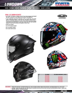 DISCLAIMER: PRODUCTS WITH EMIS CODE 1 ARE EMISSION COMPLIANT IN ALL STATES, INCLUDING CALIFORNIA. PRODUCTS WITH EMIS CODES 2 ARE EMISSION COMPLIANT IN ALL STATES EXCEPT CALIFORNIA. PRODUCTS WITH EMIS CODE 3 ARE “COMPETITION USE” ONLY, AND NOT LEGAL IN ANY STATE FOR STREET USE ON ANY POLLUTION-CONTROLLED VEHICLES. PRODUCTS WITH EMIS CODE 4 HAVE NO U.S. TERRITORY RESTRICTIONS PARTSCANADA.COM APRIL 2026 LOWDOWN STREET • OFFROAD • ATV/UTV • SNOWMOBILE • BICYCLE • TIRE & SERVICE • HELMET & APPAREL SIZE (A) CARBON (B) CARBON QUARTARARO LE MANS 3 XS 0101-19461 - S 0101-19462 0101-20179 M 0101-19463 0101-20180 L 0101-19464 0101-20181 XL 0101-19465 0101-20182 2X 0101-19466 0101-20183 RPHA 1 V2 CARBON HELMETS • HJC’s RPHA 1 V2 Carbon is a flagship racing full-face helmet developed with MotoGPlevel input, meeting ECE 22.06 standards and certified to FIM FRHPhe-02. • It uses a lightweight carbon fiber shell (about 1,400 g in size M) with a rear racing spoiler for high-speed stability, a metal visor lock, and includes a Pinlock 120 XLT lens plus an extra dark smoke visor. On track, riders will feel reduced neck fatigue, a more planted and stable helmet at speed, and a secure visor feel, with ventilation designed to move heat and moisture out quickly for better focus. • Pinlock Lens Included • Tear off Film (5pcs) Included • Rear Long Spoiler Included • Dark smoke Shield Included B A