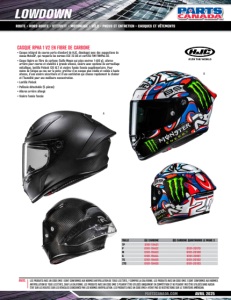 PARTSCANADA.COM AVRIL 2025 LOWDOWN ROUTE • HORS-ROUTE • VTT/VUTT • MOTONEIGE • VÉLO • PNEUS ET ENTRETIEN • CASQUES ET VÊTEMENTS AVIS: LES PRODUITS AVEC UN CODE EMIS 1 SONT CONFORMES AUX NORMES ANTIPOLLUTION DE TOUS LES ÉTATS, Y COMPRIS LA CALIFORNIE. LES PRODUITS AVEC UN CODE EMIS 2 SONT CONFORMES AUX NORMES ANTIPOLLUTION DE TOUS LES ÉTATS, SAUF LA CALIFORNIE. LES PRODUITS AVEC UN CODE EMIS 3 PEUVENT ÊTRE UTILISÉS UNIQUEMENT EN COMPÉTITION ET NE PEUVENT PAS ÊTRE UTILISÉS DANS AUCUN ÉTAT SUR LES ROUTES SUR LES VÉHICULES CONCERNÉS PAR LES NORMES ANTIPOLLUTION. LES PRODUITS AVEC UN CODE EMIS 4 N’ONT PAS DE RESTRICTIONS SUR LE TERRITOIRE AMÉRICAIN. TAILLE (A) CARBONE (B) CARBONE QUARTARARO LE MANS 3 TP 0101-19461 - P 0101-19462 0101-20179 M 0101-19463 0101-20180 G 0101-19464 0101-20181 TG 0101-19465 0101-20182 2TG 0101-19466 0101-20183 CASQUE RPHA 1 V2 EN FIBRE DE CARBONE • Casque intégral de course porte-étendard de HJC, développé avec des suggestions de niveau MotoGP, qui respecte les normes ECE 22.06 et certifié FIM FRHPhe-02. • Coque légère en fibre de carbone (taille Moyen qui pèse environ 1 400 g), aileron arrière pour course et stabilité à grande vitesse, visière avec système de verrouillage métallique, lentille Pinlock 120 XLT et visière fumée foncée supplémentaire. Pour moins de fatigue au cou sur la piste; profitez d’un casque plus stable et solide à haute vitesse, d’une visière sécuritaire et d’une ventilation qui chasse rapidement la chaleur et l’humidité pour une meilleure concentration. • Lentille Pinlock • Pellicule détachable (5 pièces) • Aileron arrière allongé • Visière fumée foncée B A