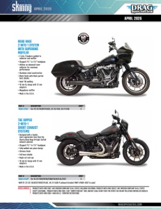 THE DRAG SPECIALTIES APRIL 2026 DRAGSPECIALTIES.COM APRIL 2026 DISCLAIMER: PRODUCTS WITH EMIS CODE 1 ARE EMISSION COMPLIANT IN ALL STATES, INCLUDING CALIFORNIA. PRODUCTS WITH EMIS CODES 2 ARE EMISSION COMPLIANT IN ALL STATES EXCEPT CALIFORNIA. PRODUCTS WITH EMIS CODE 3 ARE “COMPETITION USE” ONLY, AND NOT LEGAL IN ANY STATE FOR STREET USE ON ANY POLLUTION-CONTROLLED VEHICLES. PRODUCTS WITH EMIS CODE 4 HAVE NO U.S. TERRITORY RESTRICTIONS PART # DESCRIPTION EMIS* 1800-2756 For 22-25 FXLRST/FLHCS, 22-25 FLHC, 18-21 FLSB 3 ROAD RAGE 2-INTO-1 SYSTEM WITH SUPERBIKE MUFFLER • 2-into-1 headers welded to collector and muffler • Stepped 13/ 4” to 1 7/ 8” headpipes • Utilizes an advanced inner collector for maximum performance • Stainless steel construction • Black finish with black partial heat shields • Hand TIG welding • 18 mm O2 bungs with 12 mm adapters • Megaphone muffler • Made in the U.S.A. PART # DESCRIPTION EMIS* 1800-27481 For 18-25 FXFB/FXFBS/FXBB/FXLRS/FLSL/FXST 3 THE RIPPER 2-INTO-1 SHORT EXHAUST SYSTEMS • Designed with a louder, more aggressive tone than the Shorty Road Rage M-Eight Softail exhaust systems • Stepped 13/ 4” to 1 7/ 8” headpipes • Fully welded one-piece design • Chrome finish • Full heat shields • Angle cut end cap • 18 mm O2 bungs with 12 mm adapters • Made in the U.S.A. 1 Will fit 22-25 FXLRST/FXRST/FLHC, 18-21 FLSB if exhaust bracket PART #1861-1837 is used.