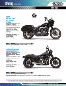 THE DRAG SPECIALTIES AVRIL 2026 DRAGSPECIALTIES.COM AVRIL 2026 AVIS: LES PRODUITS AVEC UN CODE EMIS 1 SONT CONFORMES AUX NORMES ANTIPOLLUTION DE TOUS LES ÉTATS, Y COMPRIS LA CALIFORNIE. LES PRODUITS AVEC UN CODE EMIS 2 SONT CONFORMES AUX NORMES ANTIPOLLUTION DE TOUS LES ÉTATS, SAUF LA CALIFORNIE. LES PRODUITS AVEC UN CODE EMIS 3 PEUVENT ÊTRE UTILISÉS UNIQUEMENT EN COMPÉTITION ET NE PEUVENT PAS ÊTRE UTILISÉS DANS AUCUN ÉTAT SUR LES ROUTES SUR LES VÉHICULES CONCERNÉS PAR LES NORMES ANTIPOLLUTION. LES PRODUITS AVEC UN CODE EMIS 4 N’ONT PAS DE RESTRICTIONS SUR LE TERRITOIRE AMÉRICAIN NO PIÈCE DESCRIPTION EMIS* 1800-2756 Pour 22-25 FXLRST/FLHCS, 22-25 FLHC, 18-21 FLSB 3 SYSTÈME ROAD RAGE 2-EN-1 AVEC SILENCIEUX SUPERBIKE • Collecteurs d’échappement 2-en-1 soudés au collecteur et au silencieux • Collecteurs à étapes de 1-3/4 po à 1-7/8 po • Intègre un collecteur interne avancé pour des performances maximales • Construction en acier inoxydable • Finition noire avec boucliers thermiques partiels noirs • Soudure TIG manuelle • Douilles filetées pour capteurs O2 de 18 mm avec adaptateurs de 12 mm • Silencieux mégaphone • Fabriqués aux États-Unis. NO PIÈCE DESCRIPTION EMIS* 1800-27481 Pour 18-25 FXFB/FXFBS/FXBB/FXLRS/FLSL/FXST 3 SYSTÈMES D’ÉCHAPPEMENT COURTS THE RIPPER 2-EN-1 • Conçus pour fournir un son plus puissant et plus agressif que les systèmes d’échappement Shorty Road Rage M-Eight Softail • Collecteurs à étapes de 13/4 po à 17/8 po • Conception entièrement soudée en une seule pièce • Finition chromée • Boucliers thermiques complets • Embout taillé en angle • Douilles filetées pour capteurs O2 de 18 mm avec adaptateurs de 12 mm • Fabriqués aux États-Unis. 1 Compatibles avec les modèles FXLRST/FXRST/FLHC de 22-25, et FLSB de 18-21 si le support d’échappement n° 1861-1837 est utilisé.